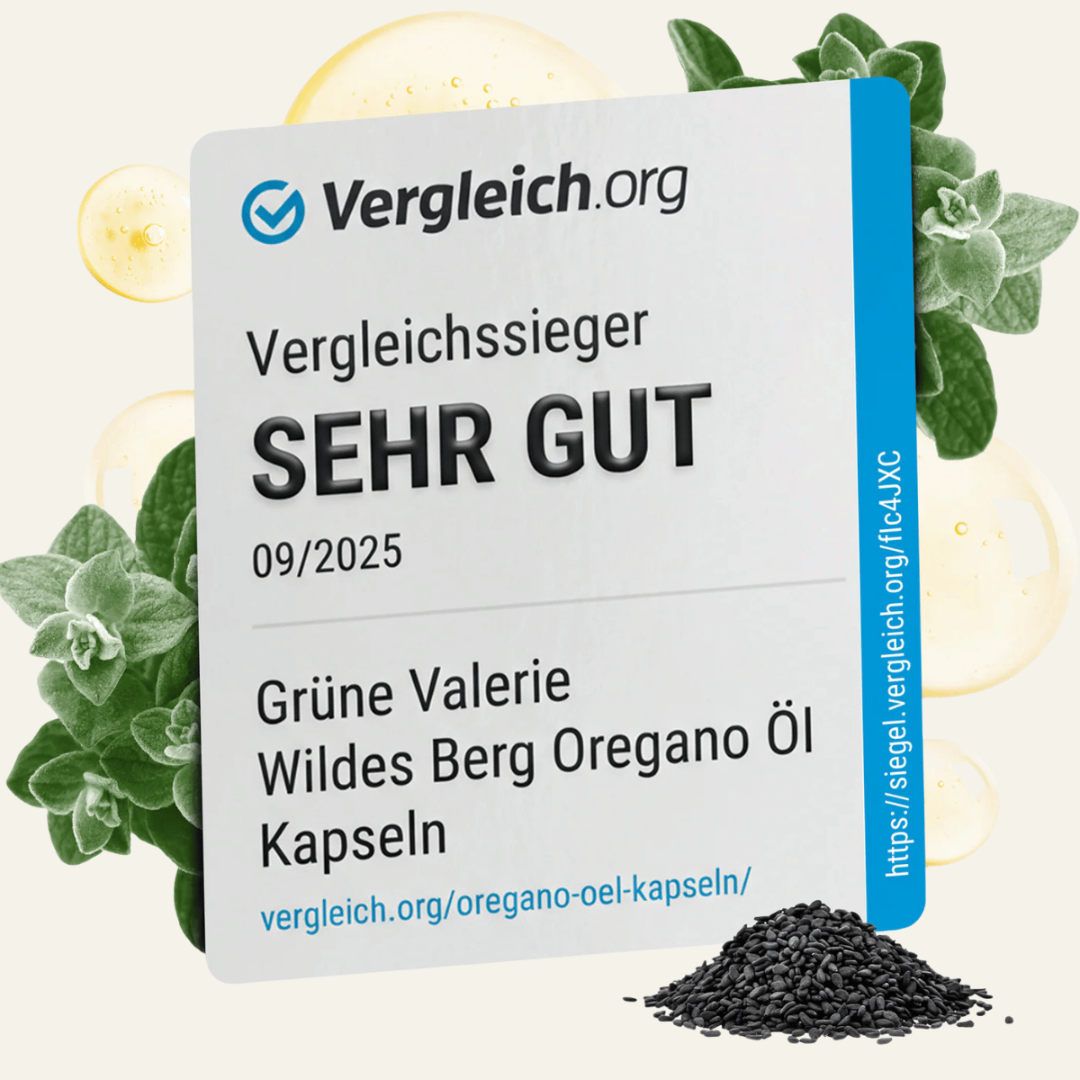 Wir sind stolz darauf, dass unsere Wildes Berg Oregano-Öl Kapseln von Vergleich.org als klarer Sieger hervorgegangen sind. Das unabhängige Verbraucherportal hat uns im September 2025 mit der Bestnote „Sehr Gut“ ausgezeichnet.