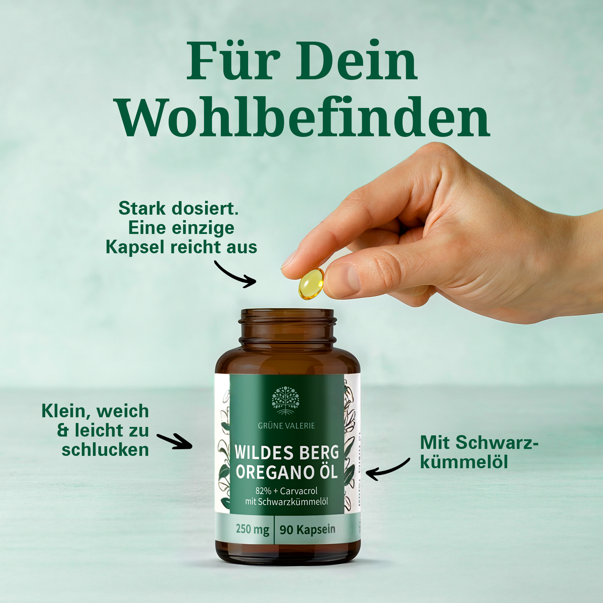 Die Einnahme unserer Oregano Öl Kapseln ist einfach und praktisch: Nimm täglich 1–2 Kapseln mit ausreichend Wasser ein. Durch die Kapselform ist das Oregano Öl geschmacksneutral und magenschonend, ideal auch für unterwegs. Im Vergleich zu Oregano Öl Tropfen profitierst du von einer komfortablen Dosierung, ohne den starken Eigengeschmack oder mögliche Hautreizungen. So lässt sich die Kraft des Oregano Öls problemlos in den Alltag integrieren.